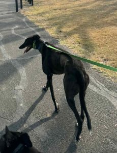 Doug would be okay to live with older dog-savvy kids as he sometimes forgets his size and is continuing to work on his personal space. He does love affection and likes to initiate getting pats on his terms, when comfortable he gets that typical greyhound lean going and is happy to just stay next to you, until he gets distracted and wanders off to explore.